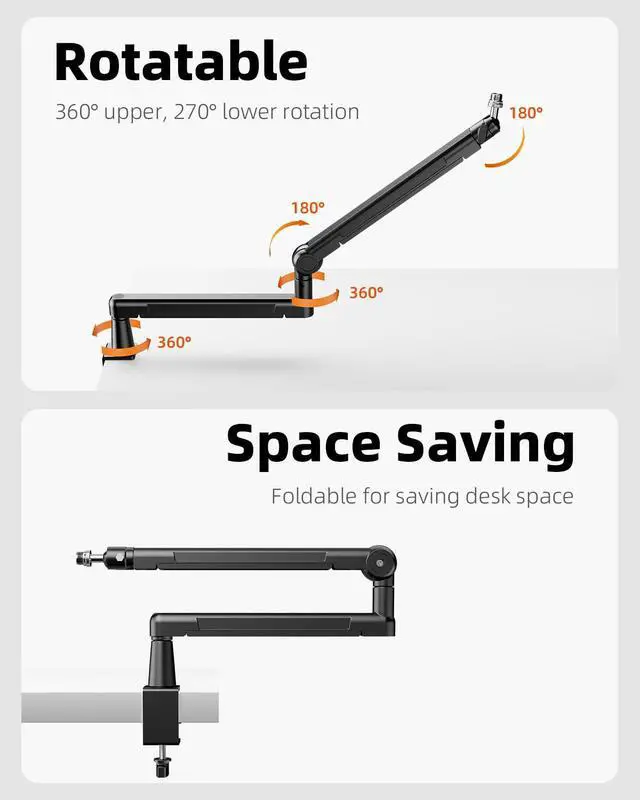 Precision Positioning: Enjoy 360° horizontal rotation of TWO hinges part and multi-angle vertical adjustments,once fixing suitable position. The tension-adjustable hinges maintain your preferred microphone position.