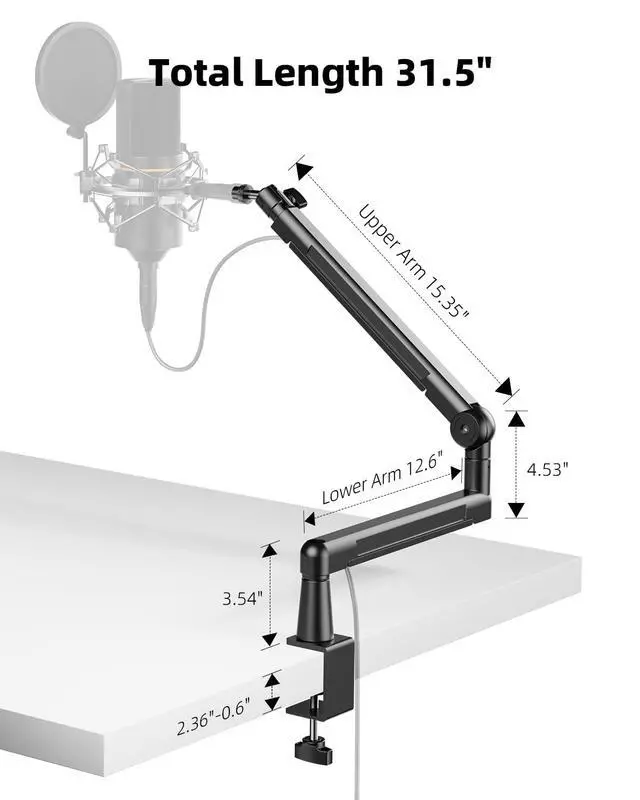 Universal Compatibility: Equipped with both 3/8" and 5/8" threaded adapters, this stand supports most popular microphones and accessories. The heavy-duty clamp fits desks up to 2.36" thick for secure mounting in any setup.