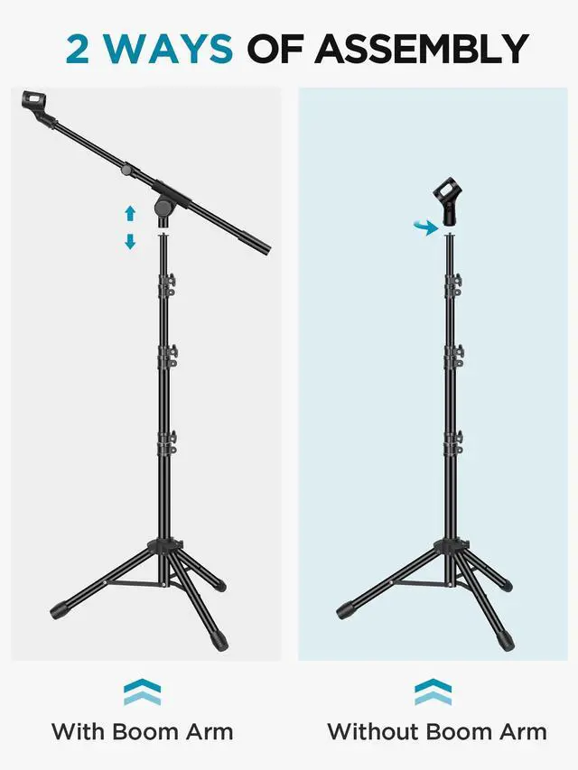 It is easy to convert the boom arm mic stand into a traditional straight tripod mic stand by removing the boom arm and attaching the mic clip. Choose the better way for different occasions such as studios, church stages, gigs, parties, outdoor performances, speeches, podcasts and live music.