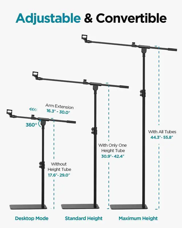 Meet the stand that adapts to your sound, not the other way around. Its intelligent modular design transforms effortlessly to meet any recording challenge. Deploy it as a compact desktop stand for podcasts and streaming, a low-profile solution for kick drums or seated guitarists (17.6"–29.0"), or a flexible mid-height stand for instruments and seated vocals (30.9"–42.4"). For full-stage presence, assemble it into a commanding professional floor stand ideal for standing vocals or overhead miking (44.3"–55.8"). This versatile performer consolidates your toolkit, eliminating the clutter of single-purpose stands. Achieve studio-perfect positioning and live-sound readiness across any recording environment.