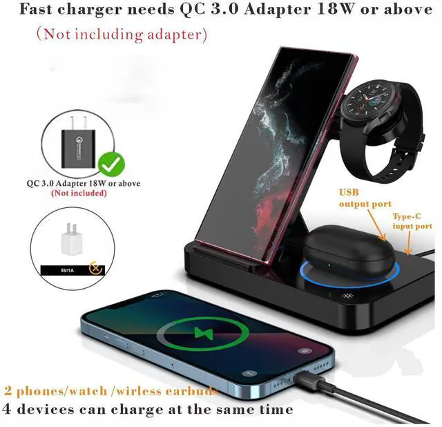 3 in 1 Wireless ChargerFor Samsung S/Note/Z Fold Series.15W 3 in 1 wireless charging station compatible with samsung Galaxy S26 Ultra S26+ S26 S25 S24 S23 Ultra/S23+/S23/S22/S21/S20/S10/Note 20/10/ Z Fold 7/6/5Not for Galaxy A SeriesNOT MAGNETI3W wireless charging dock For Galaxy Watch Ultra/8/7 6/5 pro/5/4/4 classic/3/Active/Active 2.Important Note:Not for Samsung Gear S4/S3/S2/SImportant Note : Not for Apple iWatch or other brand watch5W wireless charger for Galaxy Buds 4 3 2 Pro/2/Pro/plus/Live.Important Note: For Galaxy buds, only wireless secure charging case is supported Please check if phone/watch/earbuds support wireless charging before purchasing