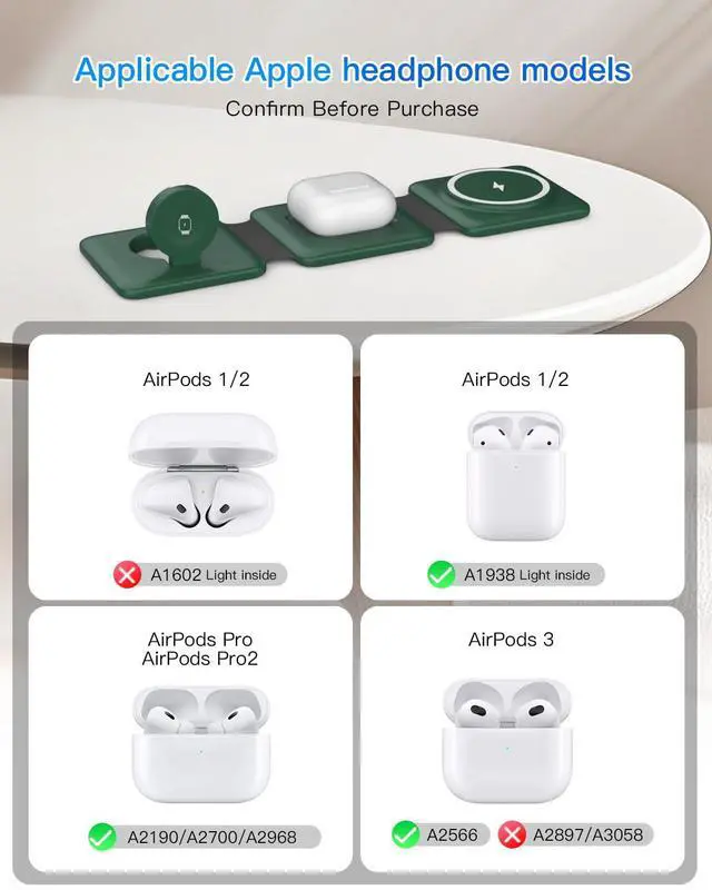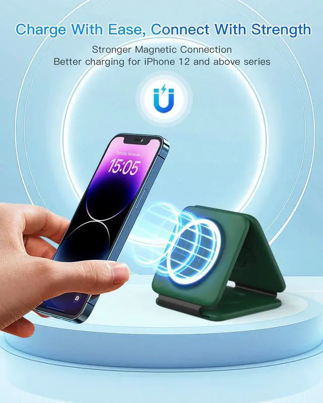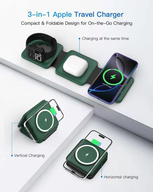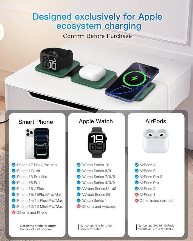 | Compatibility | iPhone, iWatch, AirPods, iPhone 17, 17 Pro, 17 Pro Max, iPhone Air, iPhone 16, iPhone 16 Plus, iPhone 16 Pro, iPhone 16 Pro Max, iPhone 15, iPhone 15 Pro max, iPhone 14, iPhone 14 Plus, iPhone 14 Pro, iPhone 14 Pro Max, iPhone 13 mini, iPhone 13, iPhone 13 Pro, iPhone 13 Pro Max, iPhone 12 mini, iPhone 12, iPhone 12 Pro, iPhone 12 Pro Max, For iWatch 10/9/8/7/6/5/4/3/2/SE/Ultra (Note: Only for Apple Watch), For AirPods 2/3/Pro/Pro 2 (Note: for AirPods 2/3, needs work with a wireless charging case ), Travel, Magnetic, Magsafe Compatible |