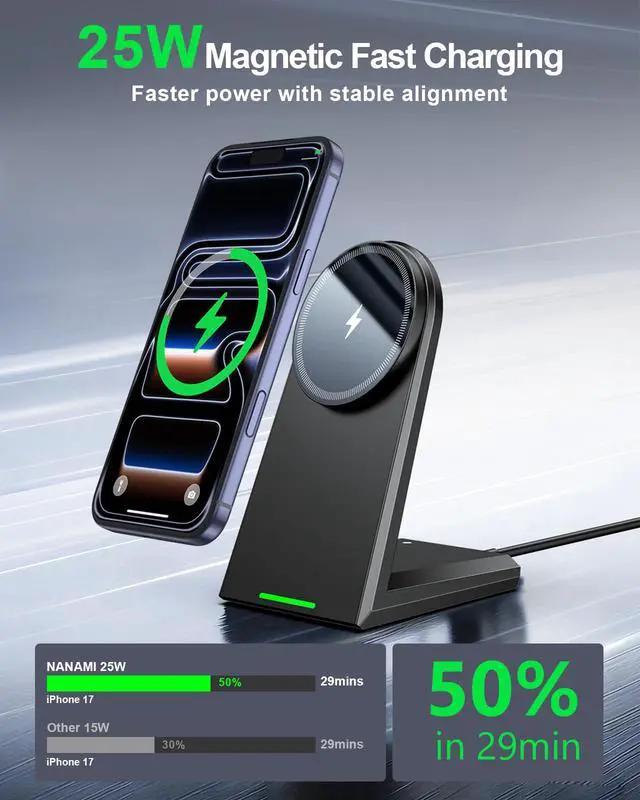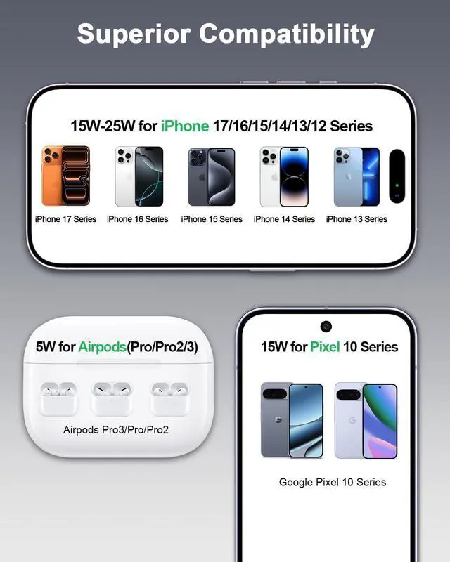 The charging pad is designed for devices with magnetic wireless charging, available for iPhone 12-17 Series,also for Google Pixel 10 Series. For optimal 25W charging, the device must be an iPhone 16 or newer, running on i0S 26 or later.