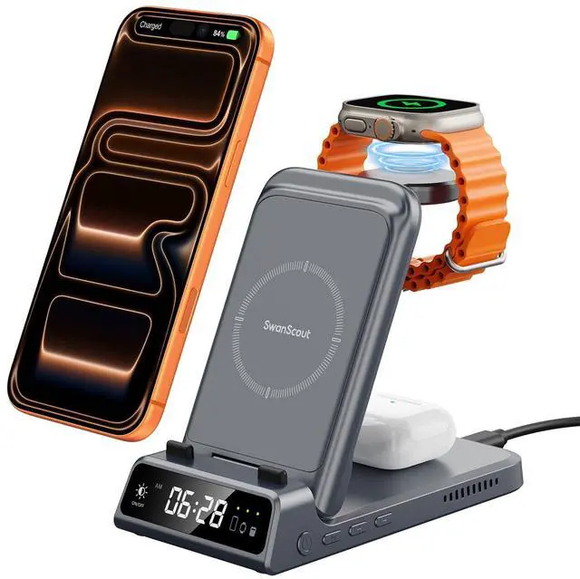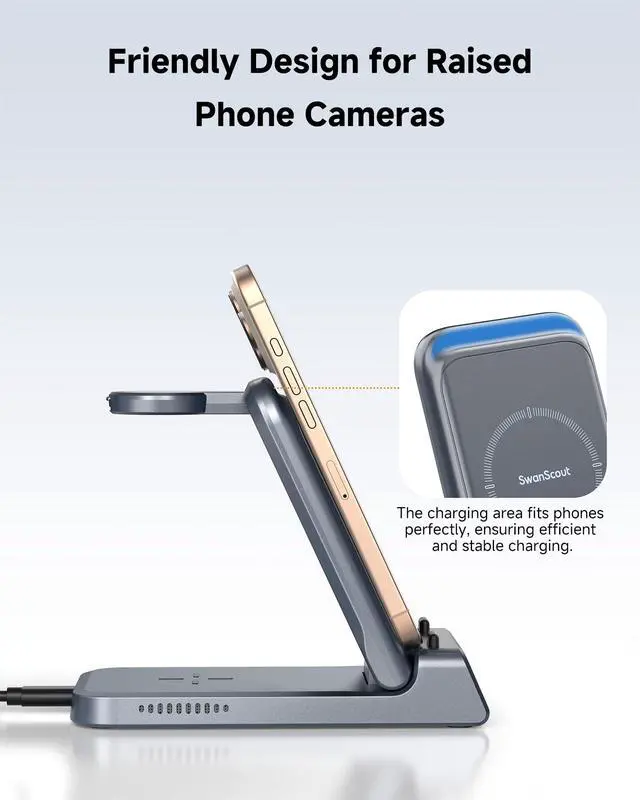 SwanScout 703A, Wireless Charger for iPhone, Charging Station for iPhone 16/15/14/13/12/11 Series, for Apple Watch 10/Ultra 2/9/8/7/SE 2, for Airpods 4/Pro 2, Foldable and Portable for Travel
