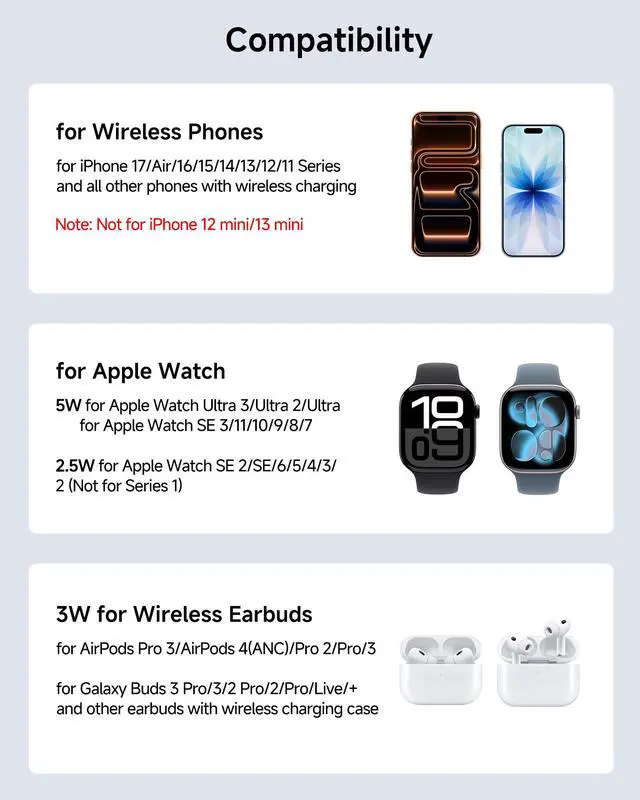 | Compatible Devices | Compatible with iPhone Air/iPhone 17 Pro Max/17 Pro/17/iPhone 16 Pro Max/16 Pro/16 Plus/16/15 Pro Max/iPhone 15 Pro/iPhone 15 Plus/iPhone 15/iPhone 14/14 Pro/14 Plus/14 Pro Max/13/13 Pro/13 Pro Max/12/12 Pro/12 Pro Max//11/11 Pro/11 Pro Max/SE/XS MAX/X/XR/8/8 Plus; For Apple Watch Ultra 2/10/9/8/7/SE 2/6/5/4/3/2/1/SE; For AirPods Pro 3/AirPods 4 ( with Active Noise Cancellation) /AirPods Pro 2/AirPods 3rd generation/Airpods 2/1/AirPods Pro and all other wireless earbuds with wireless charging case; for Samsung S25/S24/S23/S22/S21/S20/S10 Series and more; for Google Pixel 9 Pro/8/7 and other Qi-enabled phones |