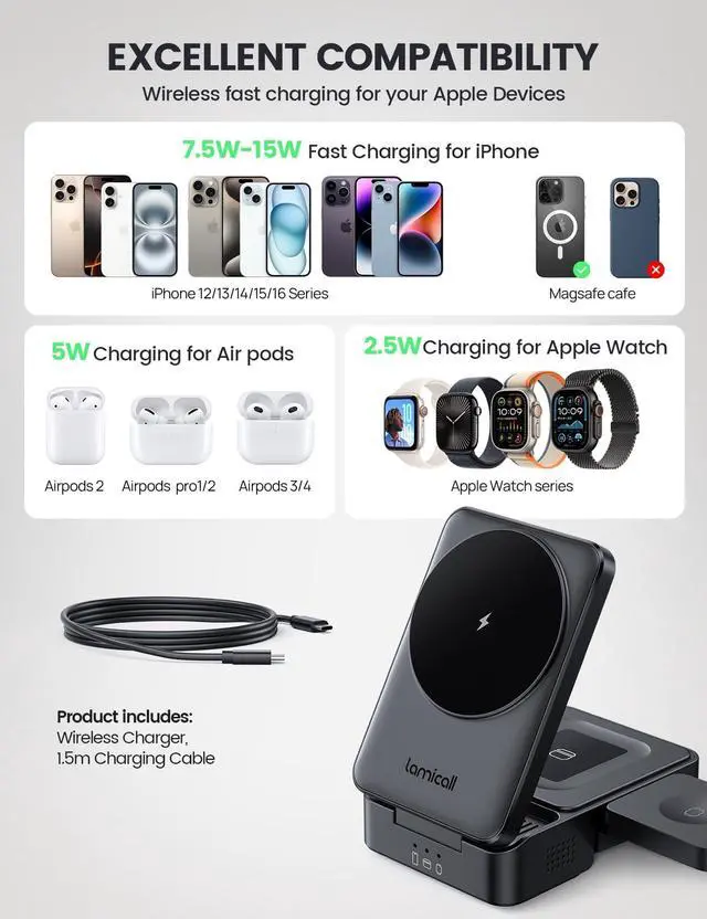 For Apple devices only. Supports iPhone 12-17 Series (excluding 16e), Apple Watch, and AirPods with a wireless charging case.