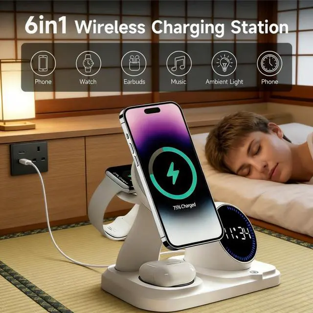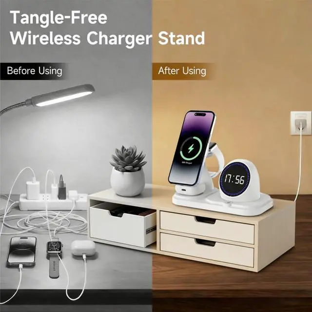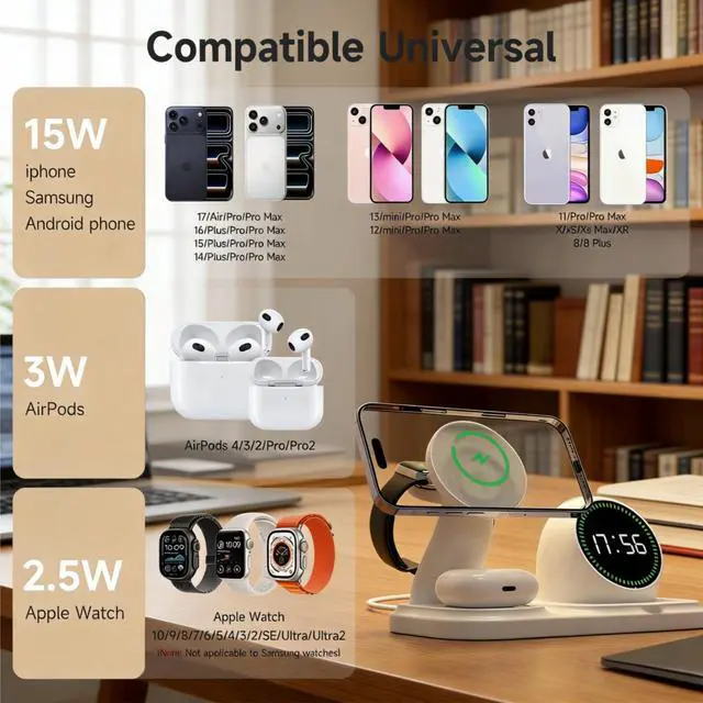 Wireless charging station can support most i-phones, fast charging wirelessly for i-Phone, iwatch, AirPods at the same time. It can be compatible with i-Phone 17/16/15/14/13/13Pro/13 Pro Max/12/12 Pro/12 Pro Max/SE/XR/X/XS/XS Max/11 Pro Max/11 Pro/11/8 Plus/8. Apples Watch 11/10/9/8/7/6/5/4/3/2/Ultra/SE, Airpods 4/3 Pro with wireless case.