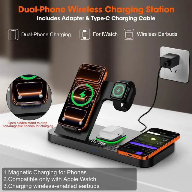 | Compatible Phone Models | [For Airpods]For Airpods 4, Airpods 3, AirPods Pro 3, AirPods Pro 2, AirPods Pro, AirPods (3rd generation), AirPods 2 Wireless Charging Case, Other Earbuds that support wireless charging. (Note: for AirPods, only work with wireless charging case, doesn't support with A3058, A2897, A1602 charging case),, [For iPhone Series]For iPhone 17, iPhone 17 Pro, iPhone 16e, iPhone 16 Pro Max, iPhone 16 Pro, iPhone 16, iPhone 16 plus, iPhone 15 Pro Max, iPhone 15 Pro, iPhone 15, iPhone 15 plus, iPhone 14 Pro Max, iPhone 14 Pro, iPhone 14, iPhone 14 plus, IPhone 13, iPhone 13 Pro, iPhone 13 Pro Max, iPhone 13 Pro Mini, iPhone iPhone 12 Pro, iPhone 12 Pro Max, iPhone 12, iPhone 11 Pro, iPhone 11 Pro Max, iPhone 11, iPhone SE (2nd generation), iPhone XS, iPhone XS Max, iPhone XR, iPhone X, iPhone 8, iPhone 8 Plus (Not compatible with iPhone 12 Mini or 13 Mini),, [For iwatch] For iWatch 11/10/9/8/7/6/5/4/3/2/1 [It is only compatible with Apple Watch, not with Samsung or other watch models.] |