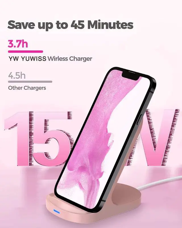 Compatible Devices: 15W/10W compatible with LG V30 /V30+/ LG V40/ LG G7/ G6/ G6 plus/ G2 / G3/Vu 2/ Vu 3 /Spectrum 2; Google Pixel 5/4/3/3 XL/Nexus7/6/5/4, Compatible with Samsung Galaxy S22 /S21 plus/S21 ultra/S20 /S20 plus/S20 ultra/ S10 / S10 plus/S9+ / S9 / S8 / S8+ / S7 edge / S7 / S6 edge+ /S10E/ S8 Active/S7 Active/S6 Active; Compatible with Samsung Note 20/Note 20 Ultra/ Note 10 / Note 10 plus/ Note 20/ Note 20 plus /Note 9 / Note 8 / Note 7; 7.5W iPhone 14 13/12/12pro/12pro Max/ iPhone 11/11pro Max/11, X/XS/XS Max, iPhone XR, iPhone 8/8 Plus; 5W Other wireless charging phones. Specifications Input: 9V/1A Output: 15W/10W/7.5W/5W Power: 15W (fast charge); 10W/7.5W (Standard charge), 5W (Normal charge) Charging Distance: 5mm Package Included: 1 * YW YUWISS Wireless Charging Stand (*Adapter not included) 1 * USB to Type-C charging cable