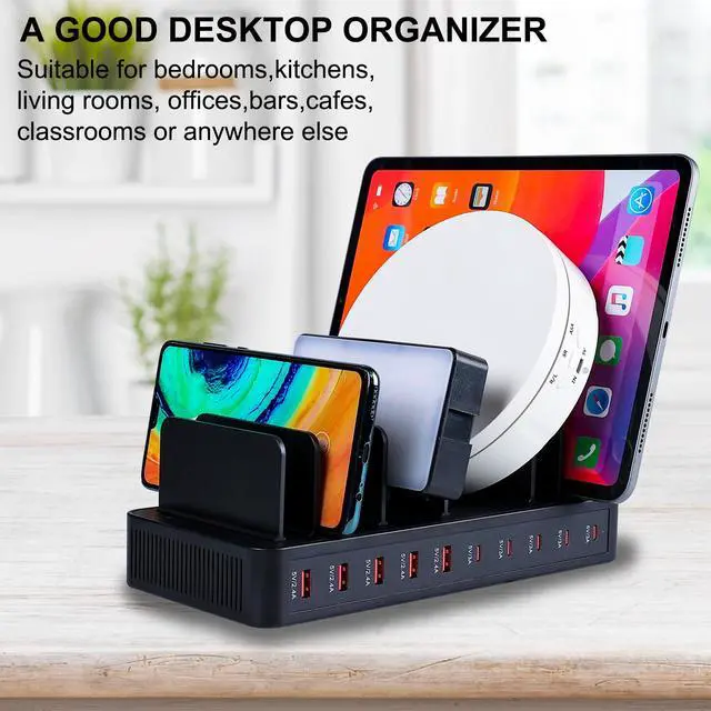 Declutter your space and keep all your devices organized and powered with this versatile 10-port charging station. Its thoughtful design accommodates multiple devices simultaneously, eliminating cable clutter and providing dedicated spaces for your phones, tablets, watches, and more.