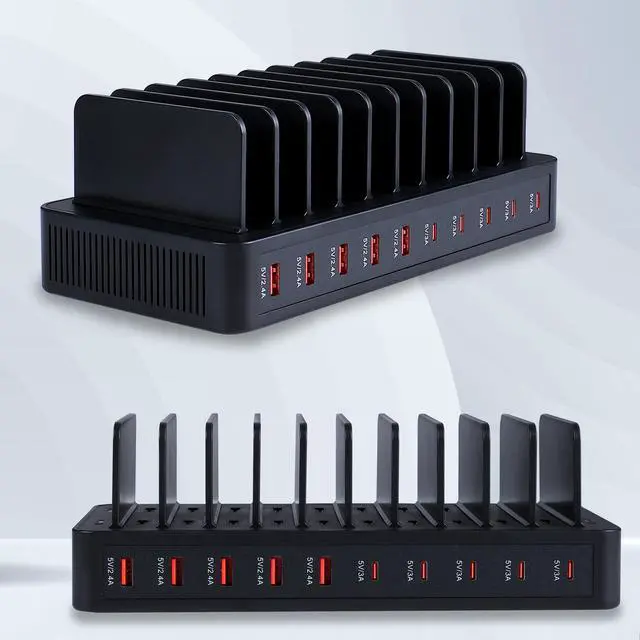 Transform your charging experience with this versatile 10-port charging station. Featuring 5 USB-A and 5 USB-C ports, it accommodates multiple devices simultaneously. The well-organized layout eliminates cable clutter while providing dedicated spaces for your phones, tablets, watches, and other electronics. This charging station serves as both a functional power hub and a neat storage solution. Its multi-device compatibility makes it perfect for families, offices, or anyone with multiple devices. The compact design maximizes desk space while keeping all your devices in one convenient location.