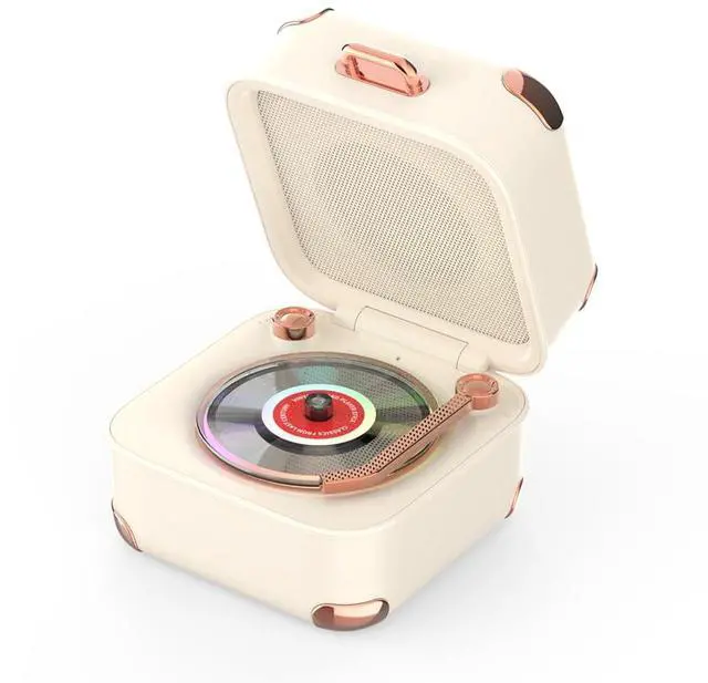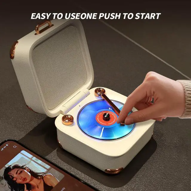 This speaker reimagines sound with a vintage suitcase design. But open it up – a hidden world awaits! A stunning faux turntable with vinyl record detail leaps into view. Crafted with a premium exterior and high-end gold-trimmed accents, it radiates sophisticated luxury – far from cheap plastic.