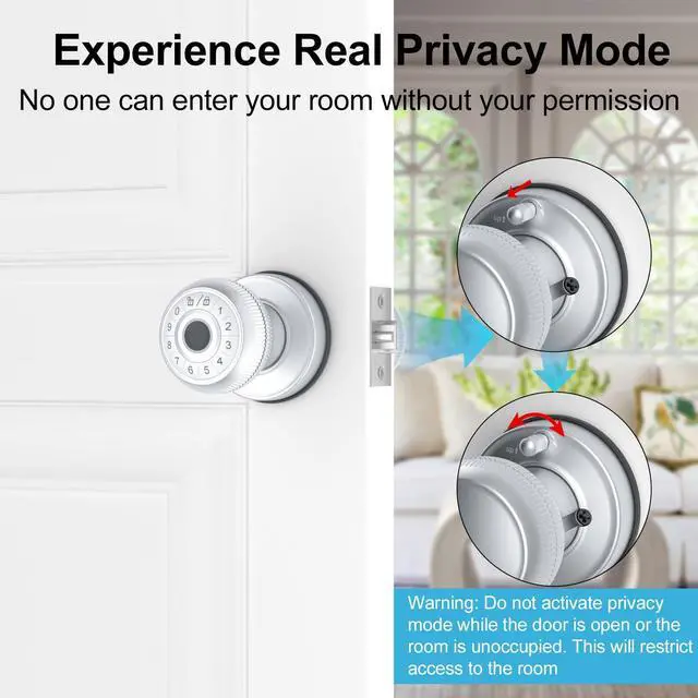 2. **Advanced Security Features:** Enhance your home security with anti-peep code technology, auto-lock functionality, and a lower battery alert system. The fingerprint door knob also includes a silent mode for discreet entry and a privacy mode for secure, uninterrupted time.
