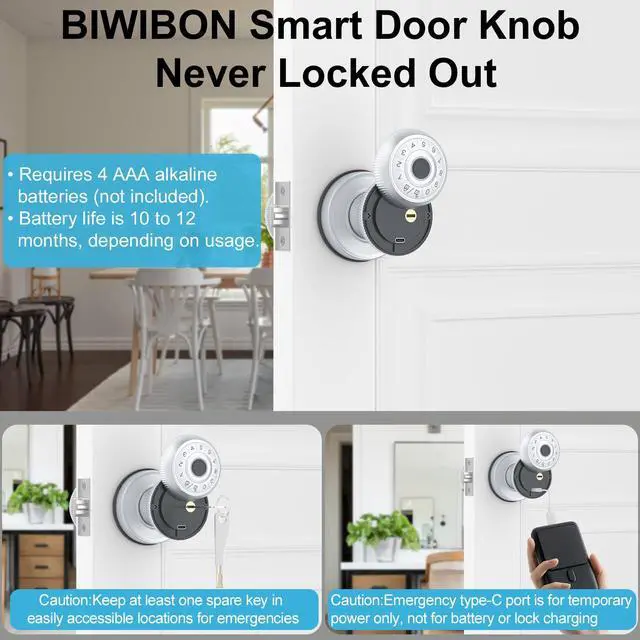 | Additional Features | Smart Door Knob with App Control offers a seamless upgrade with features including up to 100 fingerprints and passwords, Bluetooth unlock, one-touch access, auto lock, passage, privacy, and silent modes, easy installation, an emergency Type-C port for charging, and voice control when paired with the BIWIBON gateway (sold separately) |