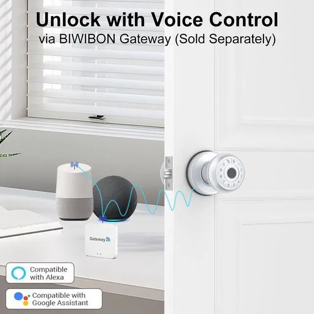 4. **Seamless Remote and Voice Control:** Pair the thumbprint door knob with the BIWIBON gateway for intuitive remote and voice control via your smartphone. Manage access, check lock status, and control settings from anywhere.