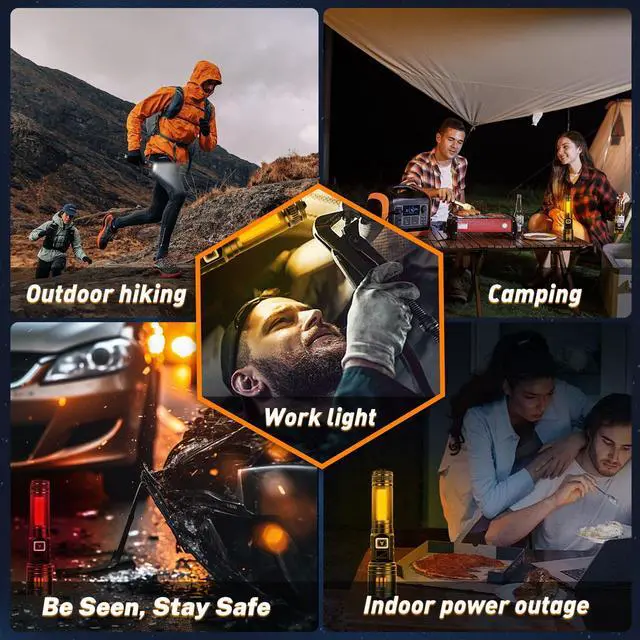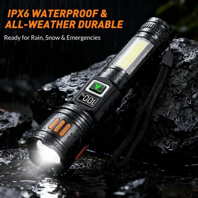 AYLs Rechargeable Flashlights 2 Pack delivers an exceptional combination of power, versatility, and convenience for all your lighting needs. Each flashlight emits a blindingly bright beam up to 900,000 lumens far brighter than ordinary flashlights easily illuminating an entire room, backyard, or campsite. The built-in LCD screen on each unit conveniently displays the remaining battery life, so youll always know when its time to recharge and wont be left in the dark unexpectedly. With a sturdy yet lightweight aluminum body, these flashlights are designed to withstand heavy use in any environment. Featuring six lighting modes, including High, Medium, Low, Strobe, and two side COB lights, the AYL flashlight adapts to any situation. Use the wide, bright white sidelight as a lantern for area lighting or camping, and switch to the flashing red light mode to signal for help during roadside emergencies. The adjustable focus allows you to zoom from a broad floodlight (for lighting up large areas) to a tight spotlight (for seeing objects at a distance) with a simple push-pull of the head. Whether youre walking the dog at night, camping in the wilderness, or dealing with a power outage, this flashlight gives you the right type of light with a quick adjustment. Enjoy the ease of USB-C fast charging no need to fumble with replacing batteries. Each unit charges up in about half the time of standard flashlights, thanks to an advanced built-in charging chip. Simply plug the included USB-C cable into the flashlights port and connect it to any USB power source (wall charger, car charger, or power bank). With robust overcharge and short-circuit protection built in, you can recharge safely and reliably hundreds of times without reducing battery longevity. A single charge provides up to 12 hours of continuous light (on medium mode), so it will last through extended outings or overnight use. Built for outdoor adventures and emergency situations, the AYL high-lumen flashlights are both rugged and water-resistant. The premium aircraft aluminum construction means you dont have to worry about minor drops or bumps its made to survive rough handling (even if you drop it on a hard surface, this strong flashlight keeps working). The IPX4 water-resistant design ensures rain or splashes wont stop this flashlight, making it reliable in stormy weather or humid conditions. Its compact size and anti-slip grip let you comfortably carry it anywhere. At just 6.1 inches long, it slides into your pocket or attaches to a belt, ready to go whenever you need a light. Get two high-performance flashlights, perfect for a variety of uses. Keep one as a spare in your home emergency kit or bedside drawer, and stash the other in your car or garage. Many customers find it handy to have one flashlight dedicated to camping and outdoor sports while the second stays at home for security or power outages. With the AYL Rechargeable Flashlights 2 Pack, youll have reliable, ultra-bright light for camping, hiking, emergencies, and everyday tasks everything from walking your dog at night to handling unexpected roadside repairs. Upgrade your gear with these powerful, long-lasting LED flashlights and experience peace of mind knowing youre prepared for the darkest situations.