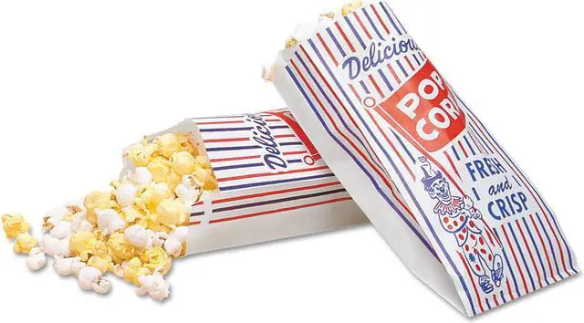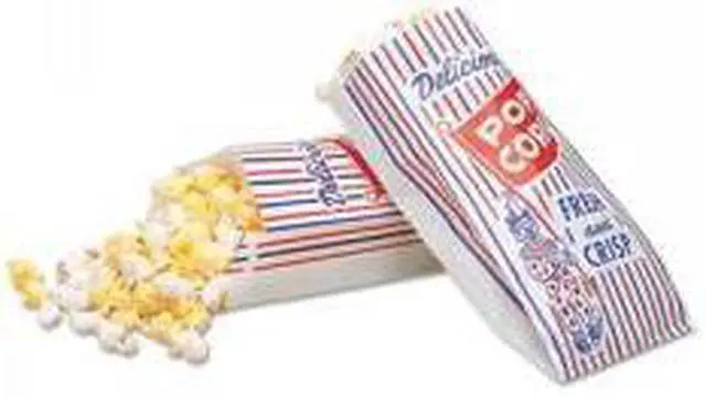 Keep foodservice fun and fresh with classic-looking, striped popcorn bags. Blue-and-red striping with a fun illustration makes bags an ideal choice for use at fairs and outdoor events. Convenient pinch-bottom bags make an easy quick-service option. Popcorn bags make an economical alternative to cartons and tubs. Commercial/Consumer Use: Commercial Use; Food-Handling Use Scenario: POS Savory Snacks; Bag Size Type: Single-Serve; Width: 4".