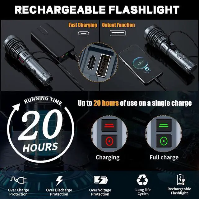 | Special Feature | 2025 Brightest Flashlight 1550,000High Lumens; 8000Ft Long Range Than Ordinary Flashlights, Adjustable Focus Between Spotlight and Floodlight; Adjustable 6 Light Modes With One Super Bright Mode Than Other Flashlight, Adjustable Strap, IP67 Waterproof; Weatherproof; Dustproof; Impact Resistant; Durable, Non Slip Grip, Rechargeable 5000mAh High Power Battery; Up to 24 Hours Runtime |