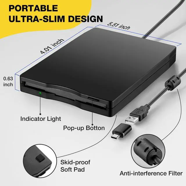 This external floppy disk drive is compatible with 3.5-inch floppy disks and is specially designed to meet your needs to access and read floppy disk data. Its simple and user-friendly design allows you to easily insert and remove floppy disks, without the need for complicated installations or drivers. Just connect the drive to your computer via a USB A/C cable, and you can instantly access the files, pictures, music, and other data stored on the floppy disks.