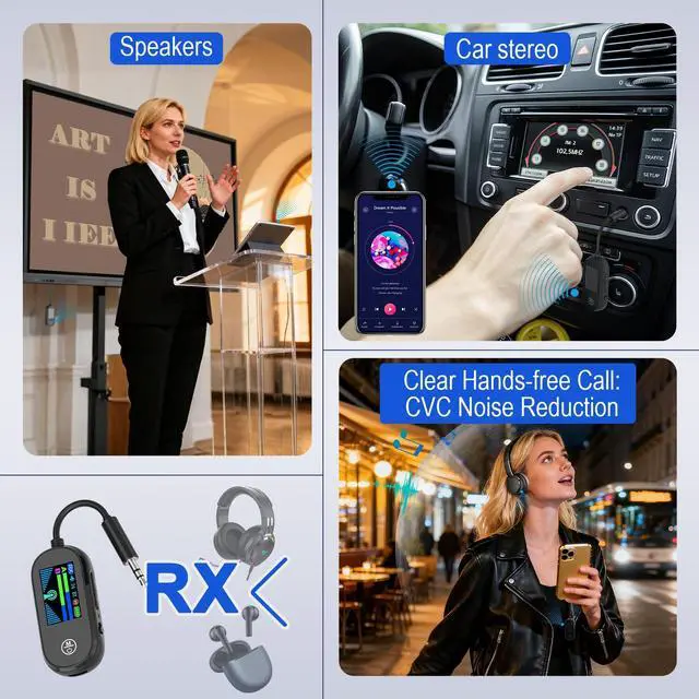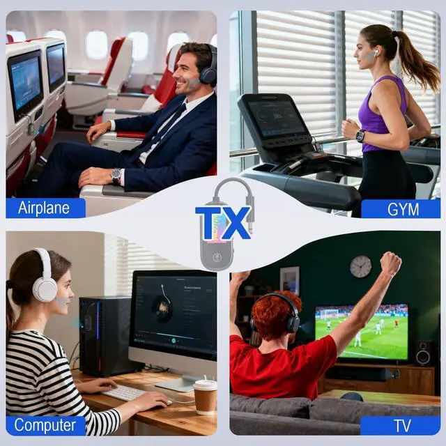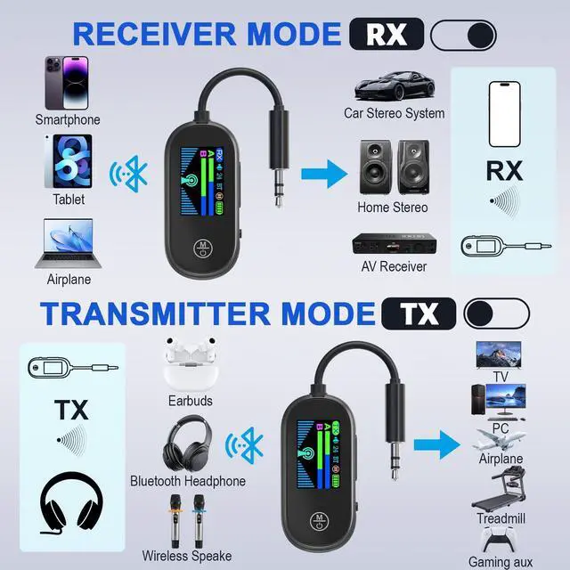 Experience complete audio versatility. In Transmitter (TX) Mode, it sends audio from your non-Bluetooth TV, airplane seat, or gym equipment directly to your wireless headphones. In Receiver (RX) Mode, it streams music from your phone to your old wired speakers or car stereo. Its standard 3.5mm jack plugs directly into airline seats, eliminating the need for a separate airplane adapter.