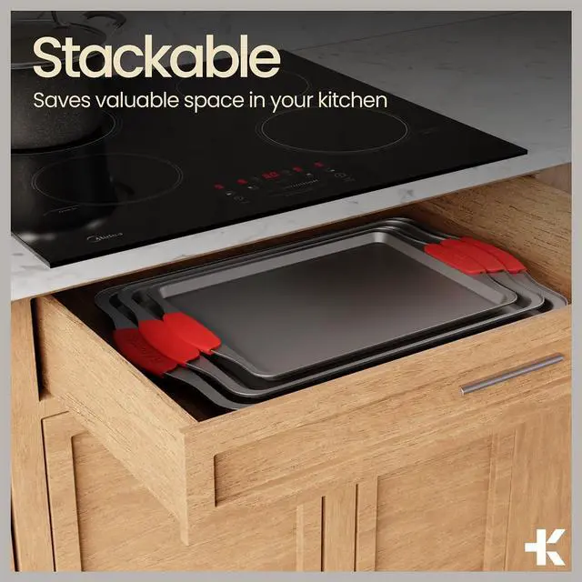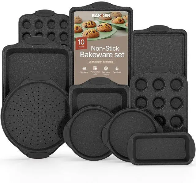The BAKKEN 10-piece Nonstick Carbon Steel Bakeware Set is the perfect addition to any kitchen, whether for home cooks or professionals. This set includes one baking pan measuring 17.32'' x 12.6'' x 1.96'', one pizza pan measuring 14.56'' x 12.99'' x 0.78'', one small cookie pan measuring 15.15'' × 10.03'' × 0.60'', two round pans both measuring 10.24'' x 9.60'' x 1.60'', a square pan measuring 10.82 × 8.74 × 1.85, one loaf pan measuring 11.69 × 5.94 × 2.55, one big cookie pan measuring 17.1'' x 11.8'' x 0.67'', twelve cup muffin pan all measuring 16.22'' x 10.43'' x 1.18'', and twenty-four cup muffin pan all measuring 16.92'' x 10.62'' x 0.98''. These pans are ideal for everything from baking cookies and croissants to roasting vegetables, ensuring even heat distribution thanks to their commercial-grade carbon steel construction. The sturdy design prevents warping, even at high temperatures, making them perfect for everyday use. The nonstick gray coating not only ensures that your baked goods slide right off but also makes cleanup a breeze, helping you save time in the kitchen. These pans are oven-safe up to 450°F, providing ample temperature resistance for a wide variety of recipes. In addition to their high performance, these pans feature a space-saving, stackable design that allows for easy storage, making them perfect for both home kitchens and professional settings. Safe for use in the oven, refrigerator, and freezer, and free from harmful chemicals like PFOA, PFOS, and PTFE, this bakeware set provides a reliable solution for all your baking needs, ensuring that every meal is prepared safely.