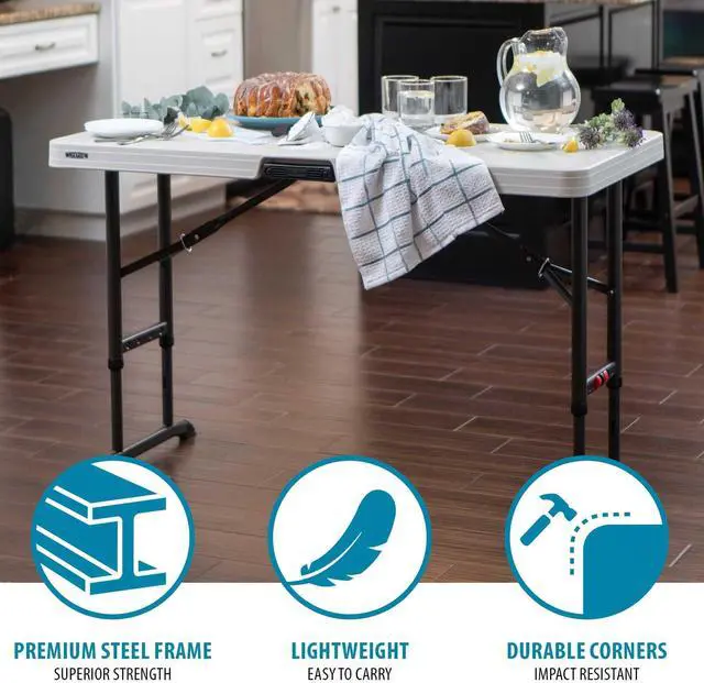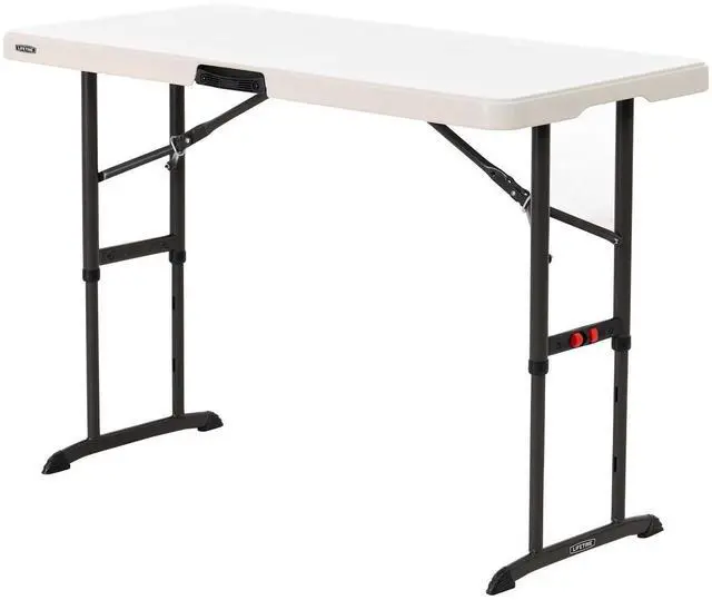 Lifetime 4-foot commercial adjustable height folding tables are constructed of high-density polyethylene & have three adjustable height settings. They will not crack, chip or peel, & are built for indoor & outdoor use. The patented steel frame design provides a sturdy foundation & is protected with a powder-coated, weather-resistant finish. Designed with an innovative one-hand adjustment mechanism, this Lifetime 4-foot adjustable height table is backed by a ten-year warranty, & is perfect for your home, office, outdoor activities & more!.
