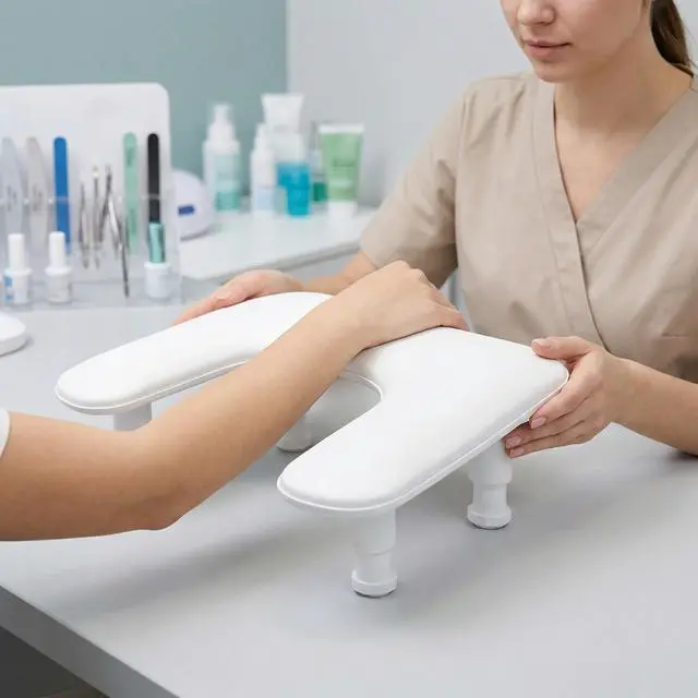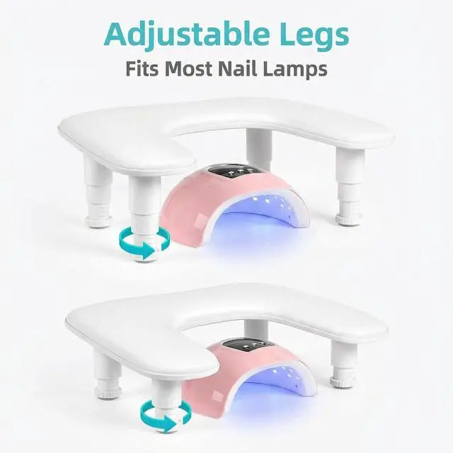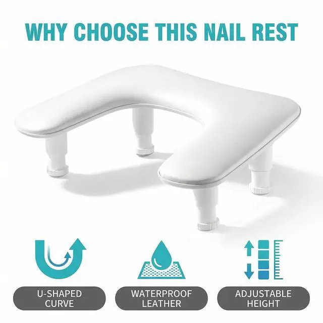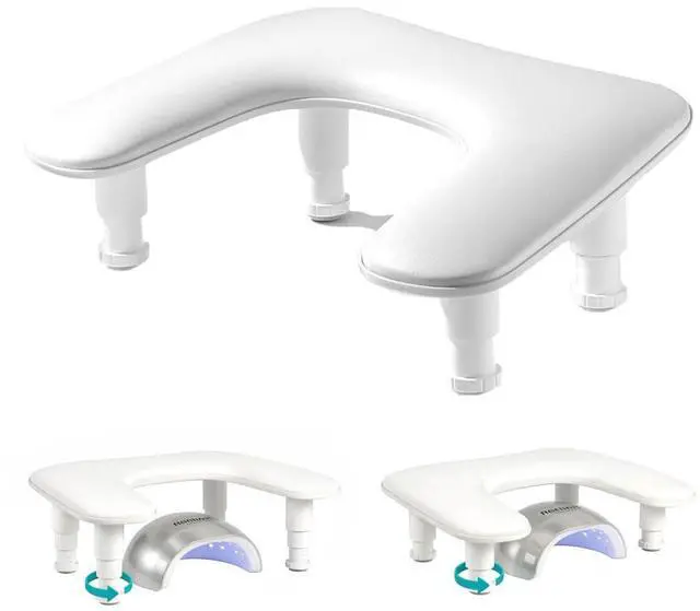 Upgrade your manicure experience with this professional U-shaped adjustable nail arm rest, designed to provide superior comfort, stability, and efficiency for both nail technicians and clients. Whether youre working in a busy salon or creating nail art at home, this essential tool helps improve posture, reduce fatigue, and enhance precision. The ergonomic U-shaped design offers a natural hand position, while the 3-level adjustable height system allows you to customize the setup to your preferred working angle. This not only minimizes wrist strain during long sessions but also creates a more relaxing experience for your clients. Built with a thick, integrated non-slip base, this nail arm rest stays securely in place on any flat surface without the need for adhesives. It prevents sliding or wobbling during use and protects your nail table from scratches, ensuring a stable and professional workstation. With its optimized size (17.4 x 11.2 x 6 inches), the arm rest provides enough space to fit most UV/LED nail lamps underneath, helping you maximize your workspace without clutter. Its the perfect balance between functionality and space-saving design. The detachable structure requires no tools for setupsimply assemble in seconds and disassemble just as easily for storage or transport. Ideal for mobile nail technicians or anyone who values convenience and flexibility. Crafted with high-resilience sponge padding and covered in premium PU leather, this arm rest delivers long-lasting comfort and durability. The surface is resistant to nail polish, acetone, and stains, making it easy to clean and maintain for daily use. A must-have accessory for professional nail techs, beginners, and beauty enthusiasts, this adjustable nail arm rest also makes a thoughtful gift for anyone passionate about nail care and nail art.