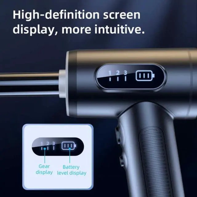 Powerful and efficient cleaning with our Compressed Air Duster. This electric air blower delivers exceptional performance with a 100,000 RPM motor and 3 adjustable airflow settings (1.86-2.51 oz), perfect for cleaning keyboards, PCs, electronic devices, and more. With a rechargeable 7500 mAh battery and Type-C fast charging, it provides up to 40 minutes of continuous use. The design includes an LED display to monitor battery level and airflow mode, as well as a built-in LED light for cleaning dark corners. Equipped with 5 nozzles and 3 brushes, this air duster for computer is versatile, eco-friendly, and an excellent alternative to compressed air cans. Lightweight, portable, and safe, its the perfect tool for cleaning at home, in the office, or in your car!