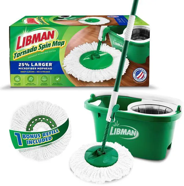 SPINNING MOP TECHNOLOGY: The Libman spin mop and bucket with wringer set for home lets you control the mops moisture to suit your needs; unlock and push the handle into the spin chamberonce for a damp mop or multiple times for a drier mop