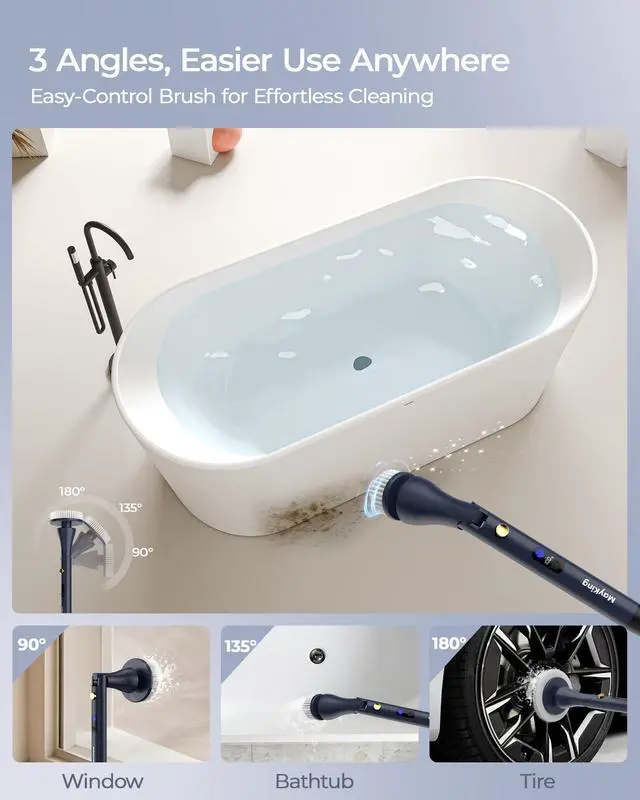 • [3 Angles & 4 Lengths, Clean Comfortably] MayKing power scrubber offers 3 brush head angles (90°/135°/180°) and 4 adjustable lengths; easy to reach tile seams, bathtub edges high ceilings, low tiles, and other cleaning dead ends; ergonomic design reduces bending, kneeling, and strain, ideal for users seeking comfortable cleaning