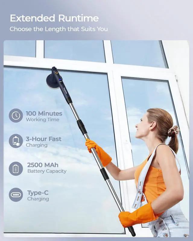 • [Long-Lasting Battery & 3-Speed Power] MayKing electric scrubber for cleaning runs up to 100 mins on a 2500mAh battery; our electric scrubber tackles everything from quick wipes to deep grout cleaning, 3 speeds (350/380/420 RPM) deliver the right power for every mess; LED display shows speed and battery level at a glance, fast 3-hour Type-C charging keeps you ready to clean