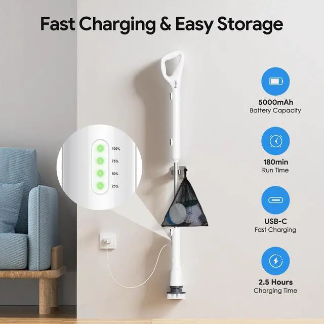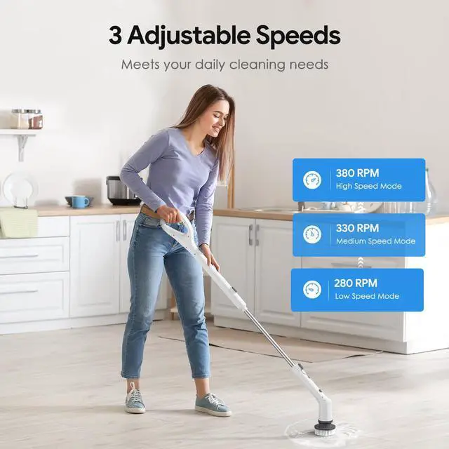 Adjustable Multi-Function Cleaning Brush: With a detachable handle extending from 24 to 48 inches, 3 adjustable speeds (380/330/280 RPM), and 2 adjustable angles, this electric cleaning brush allows you to reach various areas with ease. Fast Type-C charging provides up to 180 minutes of runtime for continuous cleaning.