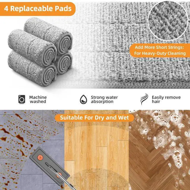 360° Rotating Mop Head:The flat mop head can rotate 360degrees, easily dealing with difficult-to-clean areas such as around furniture, corners and windowsills. Whether it is flat ground or wall, the flat mop can be quickly covered, greatly improving cleaning efficiency.