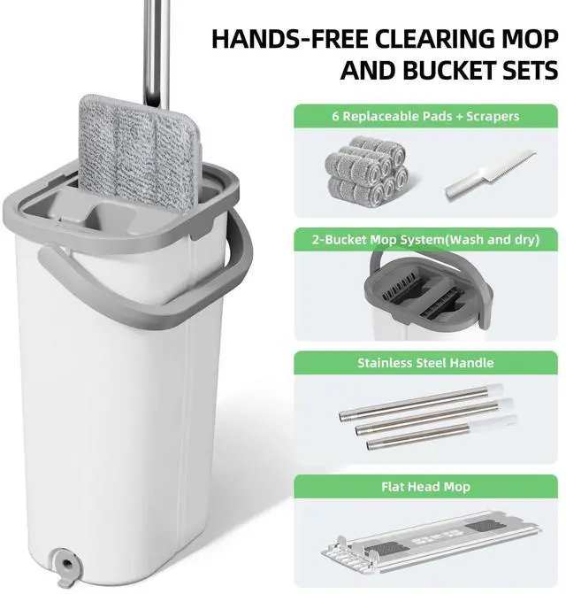 Dual Chamber Cleaning Flat Mop and Bucket System: This dual chamber cleaning flat mop and bucket system offers efficient washing and drying with simple up-down motion. The built-in serrated squeegees remove hair and dirt from the pad, keeping your hands clean and improving overall cleaning performance.