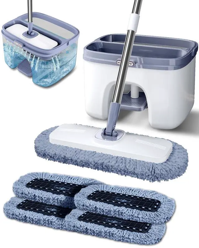 Experience effortless cleaning with our Flat Microfiber Mop and Bucket Set. The extra-wide 17.7x9in mop head covers more surface area, allowing you to clean faster. The 360° spin mop reaches tight corners and under furniture, ensuring no spot is missed. The hands-free bucket with wringer keeps your hands dry and away from germs. Included are two reusable, machine-washable microfiber pads for efficient wet and dry mopping. The ergonomic long handle reduces back strain, and the compact design makes storage a breeze.