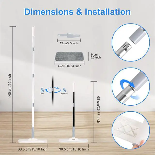 Lightweight & Adjustable Design Built with an aluminum handle, this mop is easy to maneuver and helps reduce strain during extended use. The set includes 4 adjustable rods, 1 mop head, 1 connector, 4 reusable pads, 1 hook, 1 wall piece, and 1 scraper. The handle extends from 14 to 55 inches to accommodate different cleaning needs.