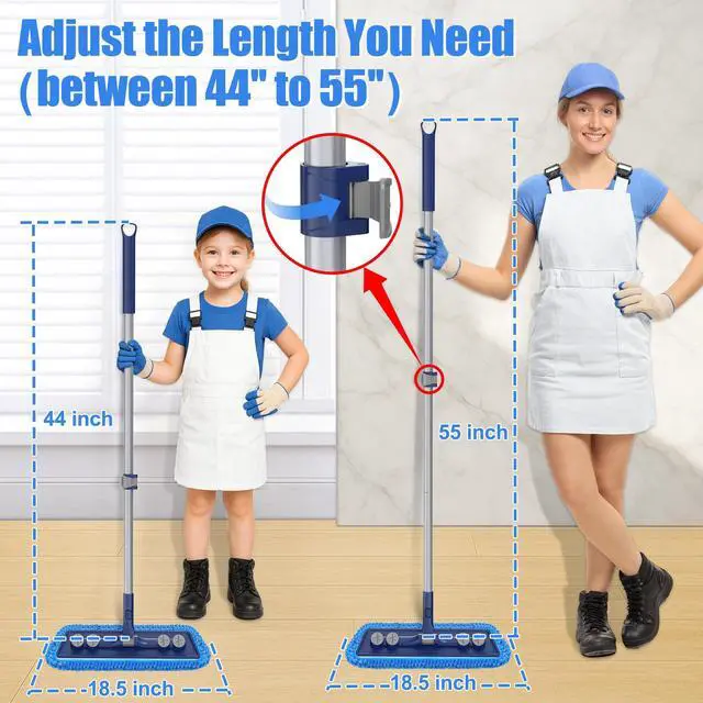Adjust the Length You NeedThe length of the dust mop can be adjusted from 44" to 55". It's lightweight and suitable for kids, ladies and the elderly. Large 18.5 mop head make cleaning quick and easy, perfect for busy homemakers and pet owners.