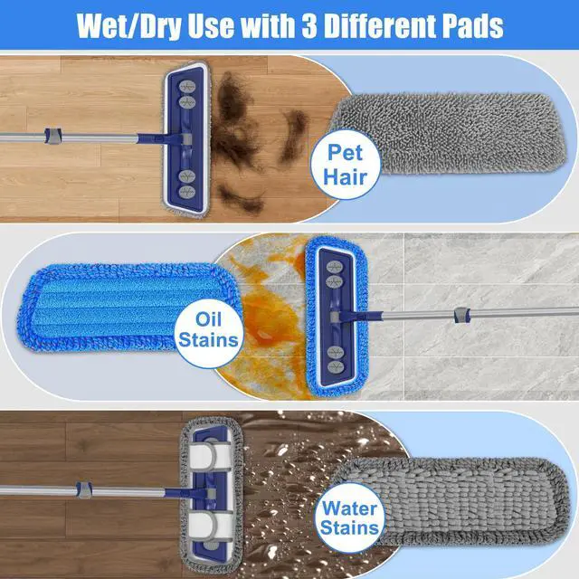 Wet & Dry Use, Thickened PadsWe have specially customized 3 different washable pads to meet your different cleaning needs, they can be wet or dry mopping for removing pet hair, water, oil stains, jucies, dirt, dust, hair and etc.