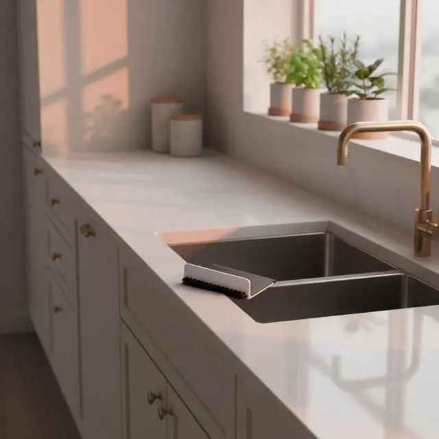 Flexible rubber blade removes water droplets from kitchen surfaces. Leaves sinks, tiles, and countertops dry after washing.