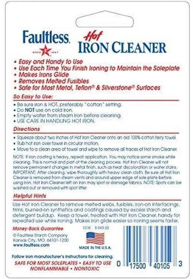 FAULTLESS Hot Iron Cleaner, Non-Toxic Steam Iron Cleaner, Removes Melted Fabrics, Glue, Hard Water, Lime Deposits & Starch