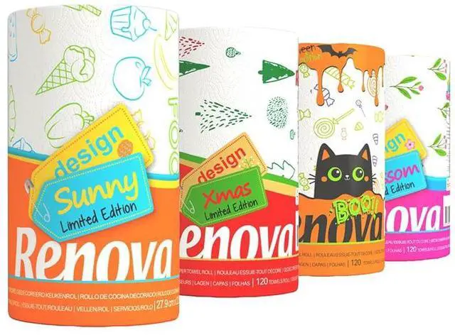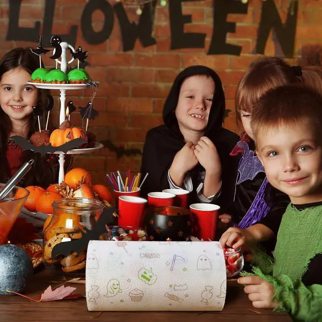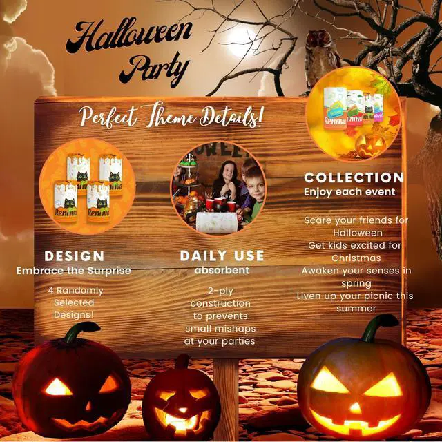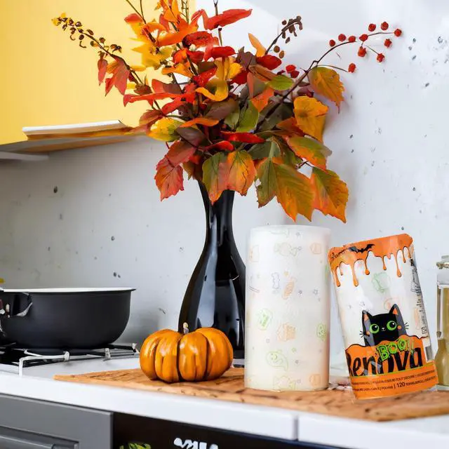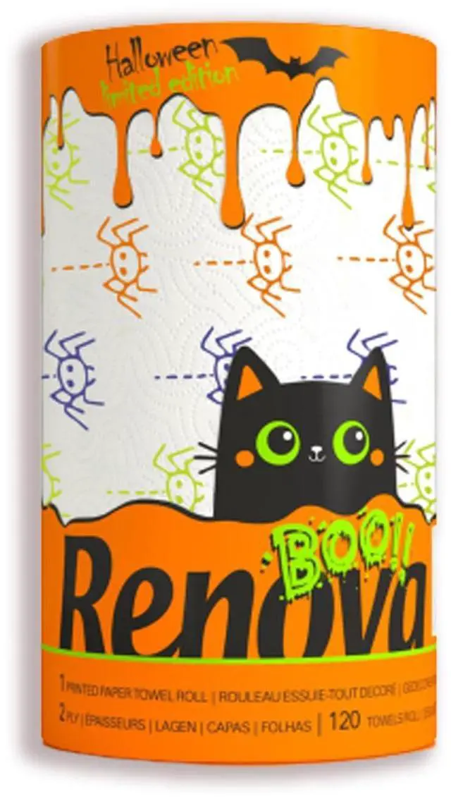 Add a spooky touch to your Halloween festivities with Renova's Limited Edition Halloween Paper Towel Roll! Each jumbo roll features 120 sheets of durable 2-ply construction, perfect for handling all your party cleanup needs. The delightful design showcases an adorable black cat with bright green eyes, accompanied by playful Halloween motifs including bats and spiders. What makes these paper towels extra special is that they come in 4 different randomly selected spooky patterns, bringing an element of surprise to every roll. These festive paper towels are not just functional but also serve as a fun Halloween decoration for your kitchen or party space. The absorbent 2-ply construction helps prevent messes during your Halloween celebrations, making them practical for both everyday use and special occasions. Whether you're hosting a Halloween party or simply want to add some seasonal flair to your home, these limited edition paper towels combine functionality with festive design to make cleanup more enjoyable.