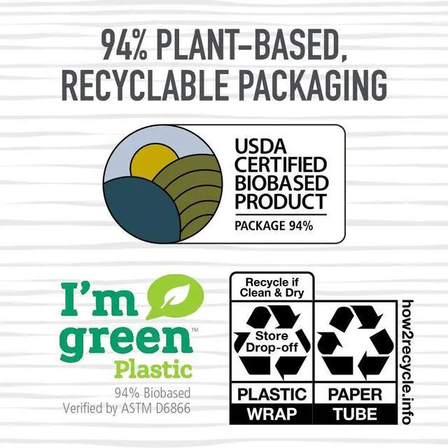 Our 94% recyclable plastic packaging is made from plant-based materials rather than from fossil fuels, making it more friendly to the environment!