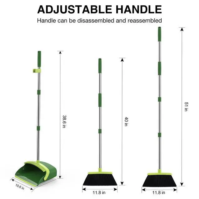 Broom and Dustpan Set, 52-in Long Adjustable Handle Broom Dustpan Combo with Dust pan Teeth to Automatically Clean Hair Suitable for Home Kitchen Office Hall FloorGreen