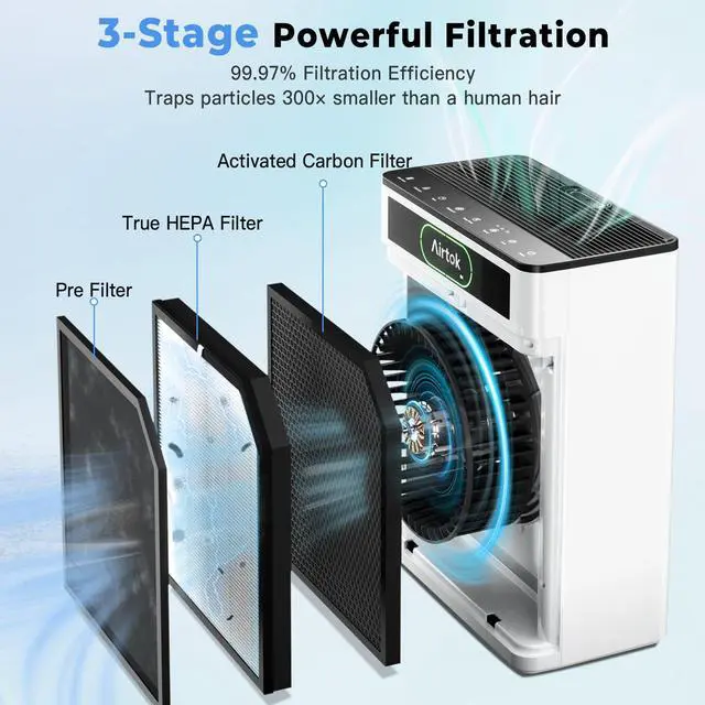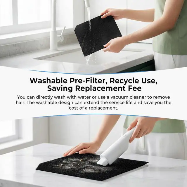 The washable pre-filter captures larger particles to extend the whole filter’s life. Depending on air quality, filters typically last 3–6 months.