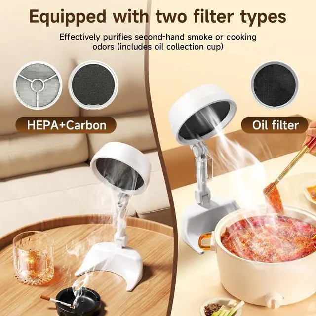Versatile Air Cleaning: Featuring two interchangeable filters for targeted purification, this purifier is perfect for eliminating smoke or oil odors, complete with a convenient oil collection cup.