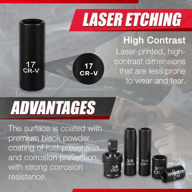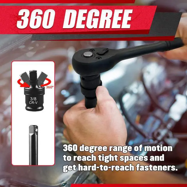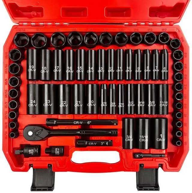| Included Components | 2 x Drive extension bars2 x Impact Adapter1 x Ratchet Set1 x Bit adaptor38 x Deep and shallow metric sockets : 6-19mm20 x Deep and shallow sae socket : 5/16",3/8",7/16",1/2",9/16",5/8",11/16",3/4",15/16",1". |