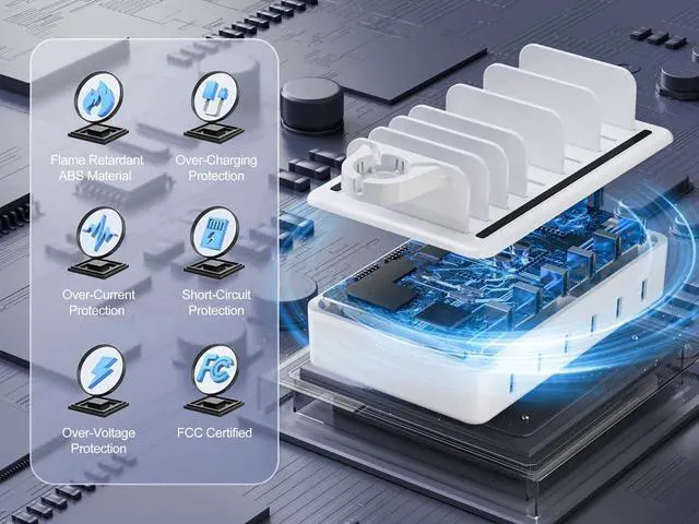 Our charging station has 6 outlets for a total of 10A , if all six devices are charged at the same time, each port has 1.6 A.
