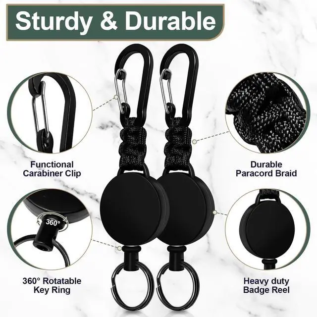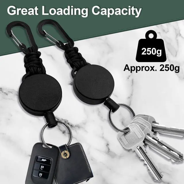 Each retractable key chain is equipped with a retractable steel cable that is 60 centimetres long and 1 millimetre thick. The built-in strong spring can withstand a load of 6 ounces and over 100000 stretches to meet your daily needs.