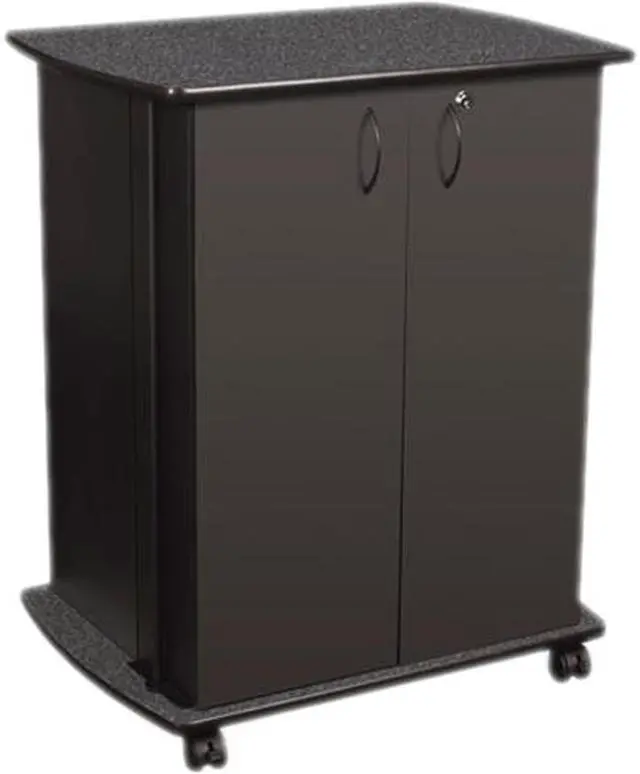 Ideal for the conference room, copy room or breakroom. Two locking swing doors with storage space for office supplies or drinks; raised edges help prevent shifting. Adjustable interior shelf accommodates items large or small. Easy mobility on four dual-wheel casters (two locking).