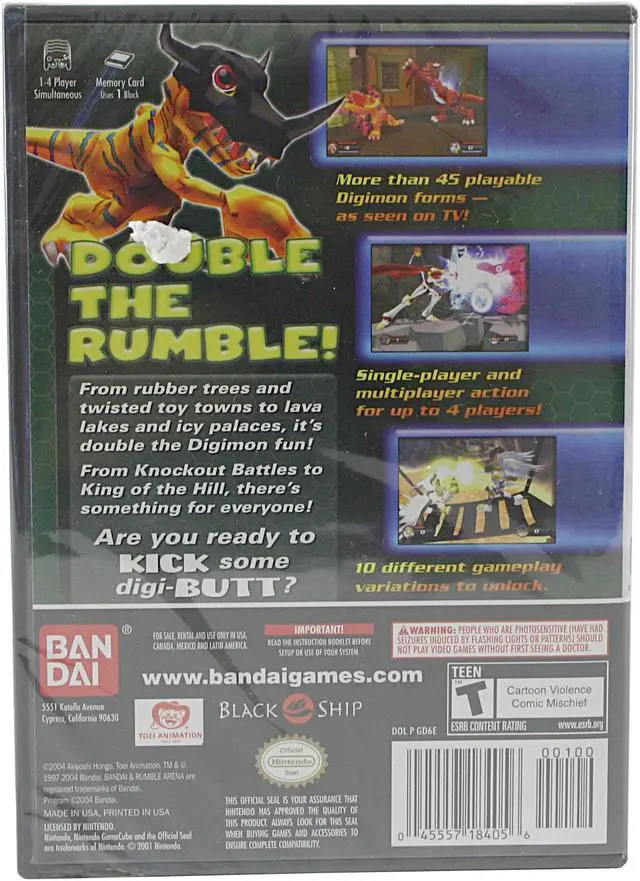 | Features | Digimon Rumble Arena leaps onto next generation platforms with a flourish! Play as one of over 40 television characters in this fast and furious fighter! Battle your way through icy glaciers and across fields of fire in this digivolving contest of skills! Featuring popular Digimon from all 4 TV seasons. Single player and multi-player modes! Compete as one of up to 4 players in Multi-Player Brawls. Use your signature move to get Digipoints then Digivolve and destroy your opponents. |